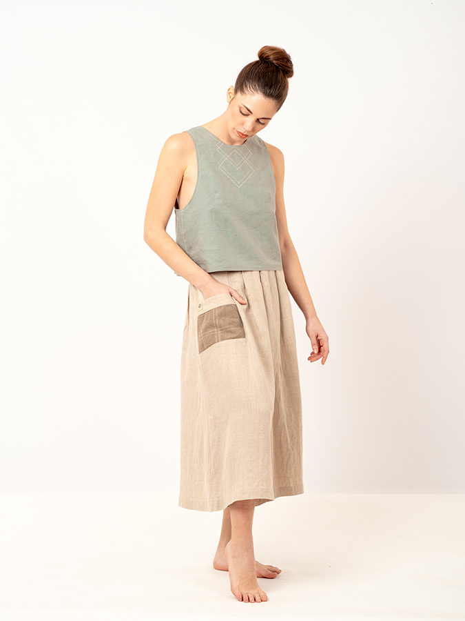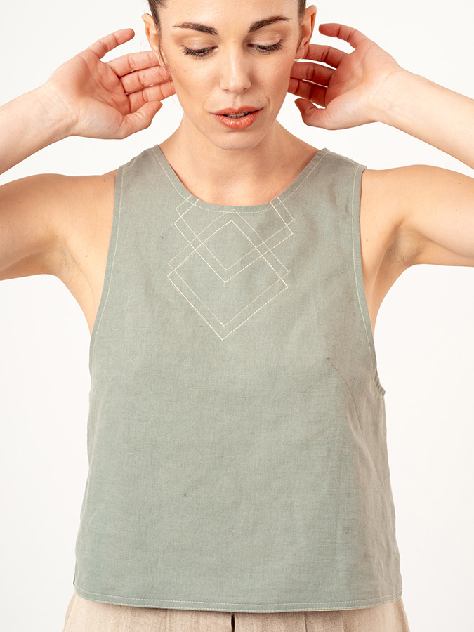 Top reversible con detalle geométrico bordado en la parte del pecho.